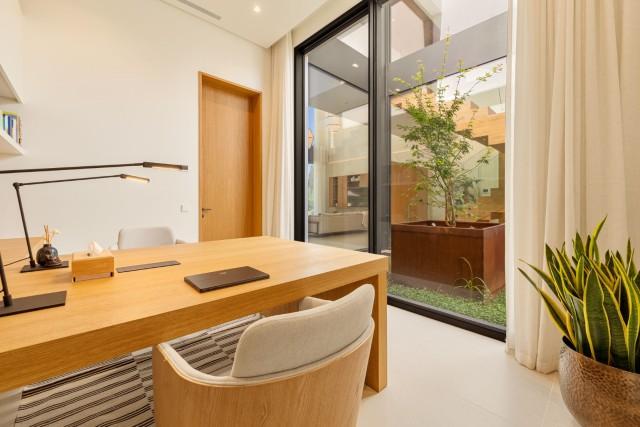 Deze uitzonderlijke, eigentijdse villa met 6 slaapkamers in Marbella toont moderne elegantie op zijn best. Gelegen op een privéperceel van 1.640 m² combineert de residentie geavanceerde architectuur met royale leefruimtes en verfijnde afwerkingen, wat een perfecte balans creëert tussen verfijning en comfort. Met meer dan 1.000 m² bebouwde oppervlakte biedt de villa een indrukwekkende indeling, ontworpen voor een moderne levensstijl. Strakke lijnen, ruime beglazing en aangelegde tuinen geven de woning een sterke visuele aantrekkingskracht en een gevoel van licht en openheid. De hoofdwoonverdieping is ontworpen voor een naadloze overgang van binnen naar buiten. Een ruime, open woon- en eetkamer staat in direct contact met de grote terrassen en het privézwembad, terwijl kamerhoge glazen deuren zorgen voor veel natuurlijk lichtinval. De designkeuken is volledig uitgerust en wordt gecompleteerd door dubbele plafonds en een doordachte indeling die de woning zowel geschikt maakt voor een ontspannen gezinsleven als voor stijlvol entertainment. De accommodatie omvat zes ruime slaapkamers, elk ontworpen voor comfort en privacy. De hoofdslaapkamer valt op door zijn luxe en-suite badkamer, inloopkast en privé-uitzicht. Een speciaal thuiskantoor zorgt voor een ideale werkomgeving, terwijl een complete entertainmentverdieping – met een fitnessruimte, mediaruimte en recreatieruimtes – veelzijdigheid biedt voor elke levensstijl. Buiten biedt de villa verzorgde gazons, zonovergoten terrassen, schaduwrijke plekken om buiten te dineren en een prachtig privézwembad. Een beveiligde toegangspoort, voldoende parkeergelegenheid en geïntegreerde klimaat- en verlichtingssystemen zorgen voor zowel gemak als gemoedsrust. Deze woning combineert schaal, kwaliteit en locatie en biedt een kant-en-klare mogelijkheid om te genieten van de prestigieuze levensstijl van Marbella. Of het nu gaat om een hoofdverblijfplaats, een vakantiehuis of een investering, het is een van de mooiste moderne woningen in de omgeving.