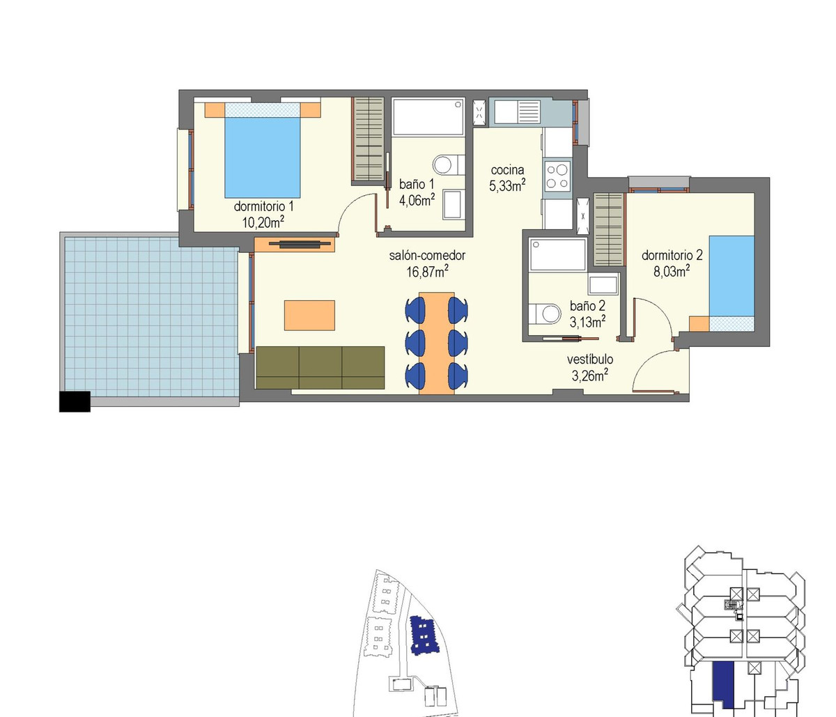 Modern appartement met terras en gedeeltelijk zeezicht – Costa Blanca Dit charmante appartement op de begane grond biedt een comfortabele mediterrane levensstijl in een van de meest gewilde gebieden van de Costa Blanca. Gelegen op slechts een paar minuten van het strand en met gemakkelijke toegang tot alle voorzieningen, is het ideaal als permanente woning, tweede huis of vakantieverhuur. De woning beschikt over 2 slaapkamers en 2 badkamers, verdeeld over een moderne, functionele ruimte vol natuurlijk licht. Een bijzonder kenmerk is het privéterras: de ideale plek om te ontspannen en te genieten van het aangename klimaat het hele jaar door, met gedeeltelijk uitzicht op zee en de natuurlijke omgeving. Specificaties omvatten: Gemeubileerde keuken met keramische kookplaat, spoelbak en afzuigkap Volledig ingerichte badkamers met meubilair en douchewand Inbouwkasten met binneninrichting Dubbele beglazing en gemotoriseerde rolluiken Uitstekende kwaliteit materialen en afwerkingen Dit appartement ligt in een rustige woonwijk met aangelegde tuinen en een vredige sfeer. Het combineert comfort, design en de nabijheid van de zee: ideaal om volop te genieten van de mediterrane levensstijl.