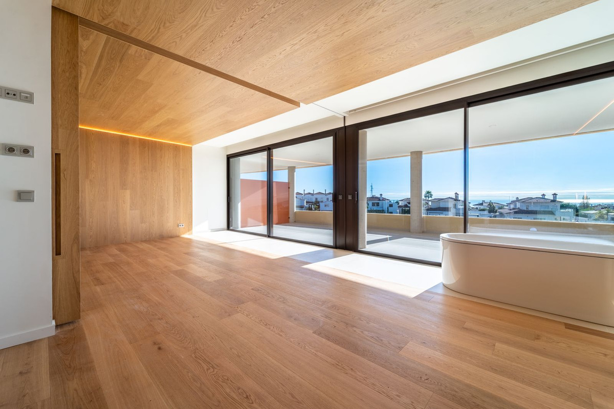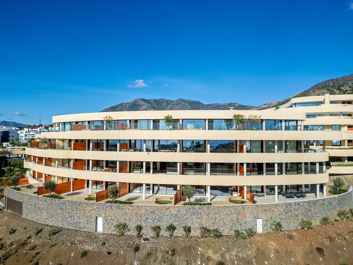 Gloednieuw, luxe appartement op het zuidoosten, gelegen in een exclusieve woonwijk, met 2 slaapkamers, 2 badkamers, een ruime woon-eetkamer, een open keuken die volledig is ingericht en uitgerust met elektrische apparaten van Bosch, een wasruimte met wasmachine/droger en een groot terras van 40 m² met prachtig uitzicht op zee. Hoofdslaapkamer met ensuite badkamer en inloopkast. Dit appartement onderscheidt zich door de ingenieuze beweegbare wand die de hoofdslaapkamer met de woonkamer verbindt. Deze langwerpige schuifdeur is ontworpen om de natuurlijke lichtinval te maximaliseren en een veel beter uitzicht te bieden. Deze naadloze overgang tussen de woonruimtes creëert een flexibele open ruimte, ontworpen om u te laten genieten van het klimaat en de levensstijl van Zuid-Spanje. Dit slimme ontwerp maximaliseert niet alleen het natuurlijke licht van de Costa del Sol in beide kamers, maar stelt u ook in staat om vanuit elke hoek van uw woning te genieten van het prachtige uitzicht. Airconditioning (warm en koud), video-intercom, domoticasysteem, alarmsysteem (voorbereiding), waterfiltersysteem, vloerverwarming in beide slaapkamers en badkamers. Inclusief twee parkeerplaatsen (waarvan één met laadpaal voor elektrische auto's) en een berging.
