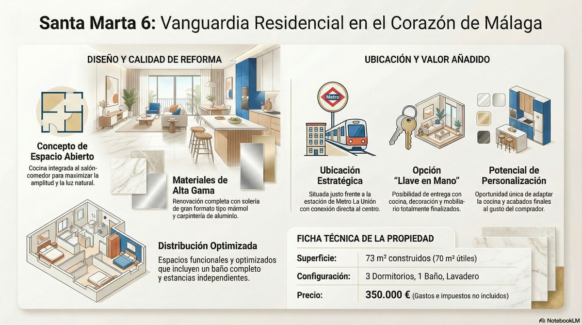 Exclusive Opportunity: Brand New Designer Home on Calle Santa Marta, Malaga This report details the characteristics and selling points of the property located at Calle Santa Marta, 6, in the established neighbourhood of Cruz del Humilladero. It is a three-bedroom flat that has undergone a complete transformation to become a modern, functional and highly efficient space. 1. Property Summary The property is located on the first floor of a building equipped with a lift. The renovation project has optimised the original layout to maximise circulation and the use of natural light. Main Features Details Location Calle Santa Marta, Cruz del Humilladero, Málaga Built Area 73 m² Usable Area 70 m² Layout 3 Bedrooms, 1 Bathroom, Integrated Living Room-Kitchen, Laundry Room Condition Completely renovated (final phase) Price €350,000 (excluding fees and taxes) 2. Selling Points and Differential Value Strategic Location and Unbeatable Connectivity The property enjoys a privileged location for urban living: Transport: Located right in front of La Unión Metro station, offering direct connections to the rest of the city, buses and trains. Proximity: A short distance from the historic centre of Malaga and Misericordia Beach. Services: Area surrounded by hospitals, local shops, educational centres and a vibrant range of amenities. gastronomic and nightlife. High-Quality Comprehensive Renovation This is not a simple facelift, but a thorough renovation that guarantees long-term peace of mind for the buyer: Installations: Complete renovation of plumbing and electrical systems. Finishes: Use of high-quality materials for tiling, flooring and cladding. Carpentry: Installation of new aluminium carpentry and modern interior doors. Air conditioning: Centralised system via ducts, visible in the technical specifications of the project. Potential for Customisation and ‘Turnkey’ As it is in the final stages of completion, the property offers unique advantages: Customised heart of the home: There is an opportunity to adapt the kitchen design to the buyer's taste and personality. Optional Service: Possibility of ‘turnkey’ delivery, which includes the completion of the kitchen, decoration and integral furniture for immediate occupancy without worries. 3. Layout Analysis (Renovation Project) The interior design has been planned under the concept of open space (‘open concept’), integrating the living area to create a welcoming atmosphere. Living Area (23.69 m²): A spacious open-plan area combining the living room, dining room and kitchen, designed to encourage social interaction and visual spaciousness. Master Bedroom (13.47 m²): Spacious and bright, with optimised storage capacity. Additional Bedrooms: Bedroom 2 (7.50 m²) and Bedroom 3 (8.73 m²), both with exterior windows that ensure ventilation and natural light. Bathroom (3.42 m²): Equipped with modern fixtures and top-of-the-line finishes. Separate Laundry Room (2.00 m²): Functional separate space for cleaning tasks, optimising order in the rest of the home. 4. Investment and Legal Aspects The property is a safe investment for both primary residence and the rental market, due to its location in a central area that is constantly increasing in value. In the case of second or subsequent transfers: ITP (Property Transfer Tax) of 7%. In the case of new homes/first transfer: VAT of 10%. Additional expenses: Stamp Duty (AJD) of 1.2% on the purchase price, plus notary and registration fees. 5. Technical Specifications of Installations (Electricity Legend) The project includes a complete technical provision according to the plans of ‘The Boutique Interiors’: Fibre optic sockets and registers for coaxial cables (RTV). Common telecommunications installation (ICT). Provision for blind motors. Specific sockets for electric water heater, extractor fan, washing machine and dishwasher. Integrated LED lighting and strategic light points in corridors and main rooms. Enjoy excellent public transport connections, proximity to the historic centre and the beach. In addition, this area is known for its vibrant nightlife, charming shops and wide range of restaurants. Please do not hesitate to contact us for further information and to arrange a viewing without obligation. We will be delighted to assist you.