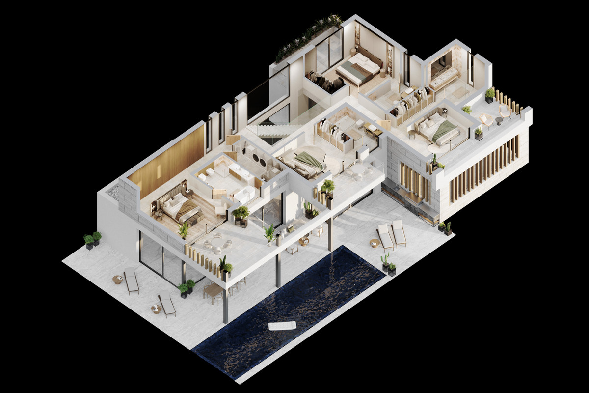Deze uitzonderlijke villa is ontworpen voor mensen die waarde hechten aan ruimte, privacy en ingetogen elegantie, en staat op een privéperceel van 1.041,19 m² in een van de meest gewilde buurten van de New Golden Mile. Met een totale bebouwde oppervlakte van 603,27 m², waarvan 358,52 m² woonruimte, biedt de woning een harmonieuze balans tussen architectuur en levensstijl, waarbij elke ruimte is ontworpen om open, natuurlijk en verbonden aan te voelen. De villa beschikt over 4 slaapkamers en 4,5 badkamers, elk ontworpen met comfort en privacy in gedachten. De bovenverdieping herbergt de belangrijkste slaapvertrekken, waar de slaapkamers met eigen badkamer uitkomen op privéterrassen, die een vredig uitzicht bieden en een gevoel van rust uitstralen dat het hele huis kenmerkt. De belangrijkste leefruimte is waar de villa echt tot leven komt. Een ruimtelijke open indeling verbindt de woonkamer, eetkamer en keuken tot een centrale ruimte die zowel elegant als functioneel is. Grote ramen van vloer tot plafond laten veel natuurlijk licht binnen en bieden directe toegang tot de buitenruimte, waardoor de grenzen tussen binnen en buiten vervagen. Buitenleven staat centraal bij deze woning. Met 130,22 m² aan open terrassen en 61,92 m² aan overdekte terrassen biedt de villa diverse omgevingen om de hele dag door van te genieten, van schaduwrijke loungeplekken tot zonnige ontspanningsruimtes. Het privézwembad van 47,25 m² ligt in het midden van de tuin en vormt de perfecte setting voor zowel rustige momenten als gezellige bijeenkomsten. De keuken is ontworpen als centraal element van het huis en combineert verfijnde esthetiek met functionaliteit. Strakke lijnen, hoogwaardige apparatuur en materialen van topkwaliteit creëren een ruimte die zowel visueel aantrekkelijk als zeer functioneel is. In het hele pand is de aandacht voor detail in elke afwerking terug te zien. De grootformaat vloer versterkt het gevoel van samenhang, terwijl zorgvuldig geselecteerde materialen en verfijnd timmerwerk bijdragen aan een tijdloze, moderne uitstraling. De villa beschikt tevens over een privégarage van 52,61 m² en is voorzien van geavanceerde technische snufjes zoals vloerverwarming, efficiënte klimaatregeling en slimme huisautomatiseringssystemen, die comfort en gemak in elk seizoen garanderen. Deze villa is gelegen op een bevoorrechte locatie nabij golfbanen, strandclubs en alle essentiële voorzieningen en biedt een levensstijl die gekenmerkt wordt door kwaliteit, rust en verbondenheid met de mediterrane omgeving. Een pand waar design, ruimte en locatie naadloos samenkomen.